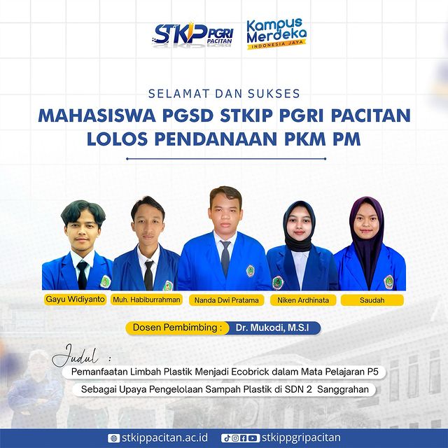 Kami sampaikan ucapan terimakasih kepada Nanda Dwi Pratama dari Program Studi Pendidikan Guru Sekolah Dasar (PGSD) STKIP PGRI Pacitan, bersama dengan Dr. Mukodi, M.S.I. sebagai Dosen Pembimbing, telah berhasil meraih Pendanaan Program Kreativitas Mahasiswa bidang Pengabdian kepada Masyarakat (PKM-PM) skema pendanaan tahun 2024.