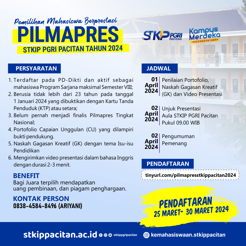 Diumumkan kepada selurah mahasiswa STKIP PGRI Pacitan terkait dengan Pemilihan Mahasiswa Berprestasi (Pilmapres) tahun 2024. Sehubungan dengan situasi yang terkait dengan penyesuaian jadwal dan proses administratif, kami dari panitia Pilmapres tahun 2024 melakukan penundaan penutupan pendaftaran yang sebelumnya dijadwalkan pada tanggal 24 Maret 2024.
